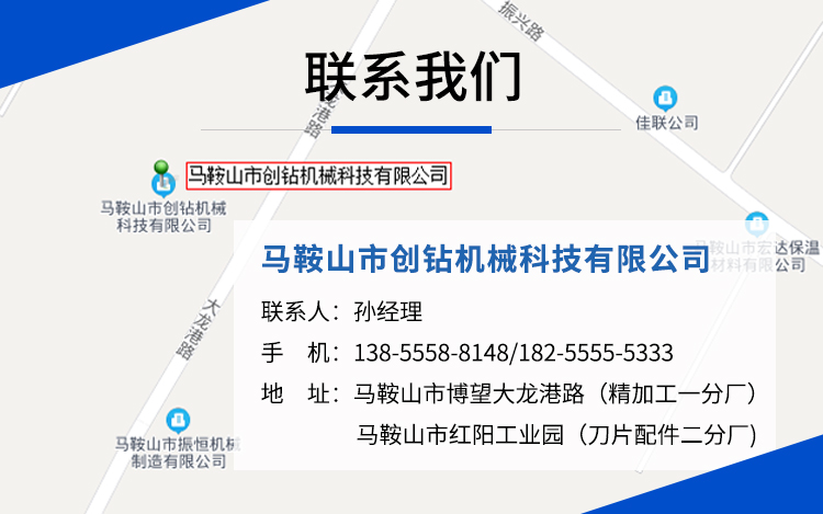 地址:馬鞍山市博望大龍港路(精加工一分廠) 馬鞍山市紅陽工業(yè)園(刀片配件二分廠)